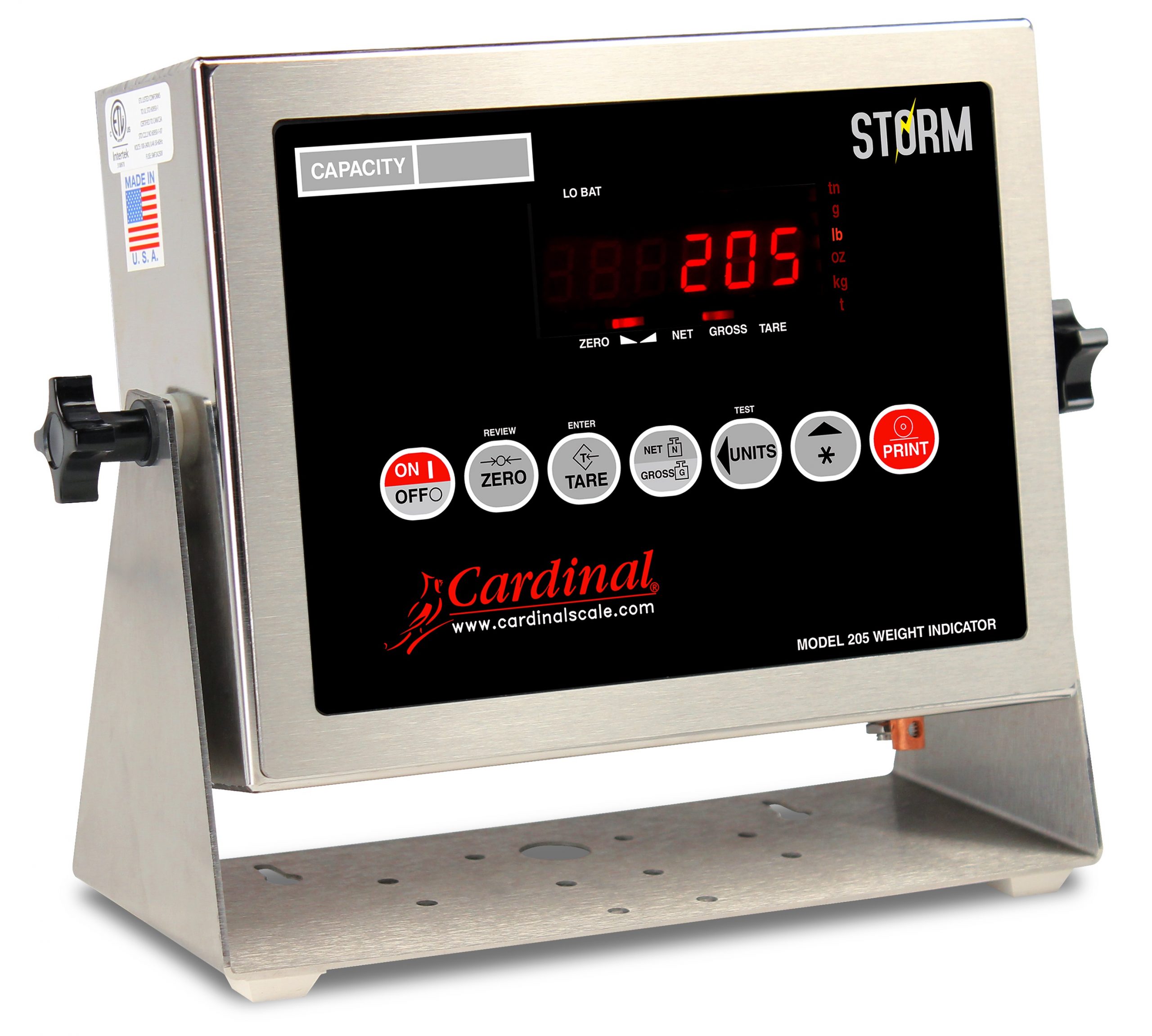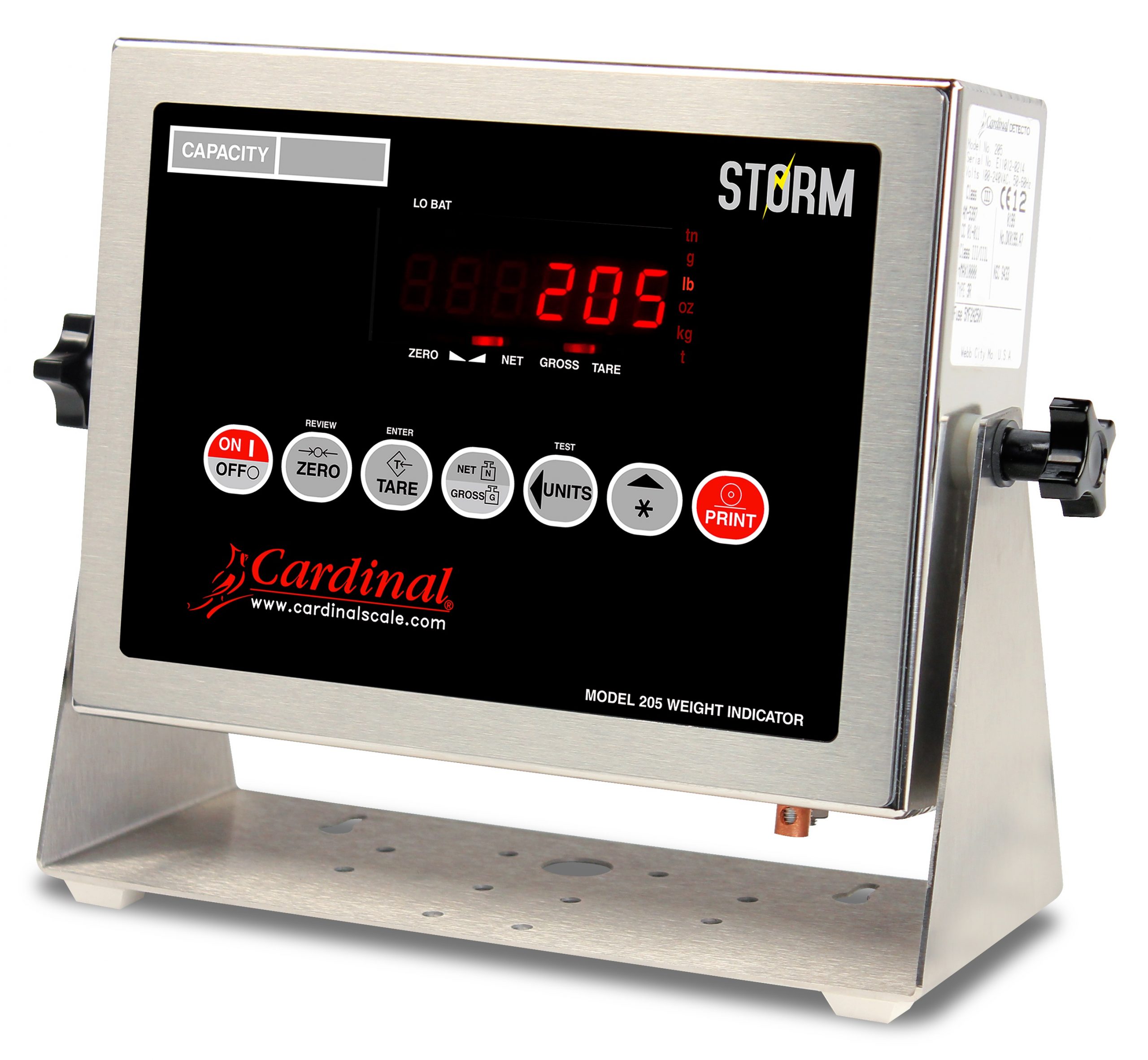 The Cardinal model 205 is a reliable general-purpose weight indicator which may be connected to bench, floor, overhead track, tank/hopper, livestock or even truck scales. The stainless steel desk or wall-mountable enclosure ensures accurate, reliable operation in harsh environments and washdown applications. An easy-to-read 0.6-inch/15 mm high bright-red LED displays weight to six digits while push-button Gross, Tare, Net conversion, StableSENSE adjustable filtering, selectable key lockout, flexible print formats, selectable weight units, auto shutoff and sleep mode make the 205 easy to use. Four bi-directional RS232 serial ports, four input control lines, optional SnapStream wireless, USB-B standard, and USB-A optional features provide multiple connectivity options. NTEP, OIML, Measurement Canada, Australian NSC, ETL, and CE.